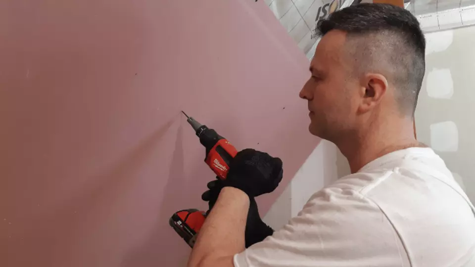 Na CD profily s prilepenou klímamembránou naskruktujeme pásik sádrokartónu Rigips z totožného typu a hrúbky, ako bude opláštenie. Pásik má minimálnu šírku 120 mm.