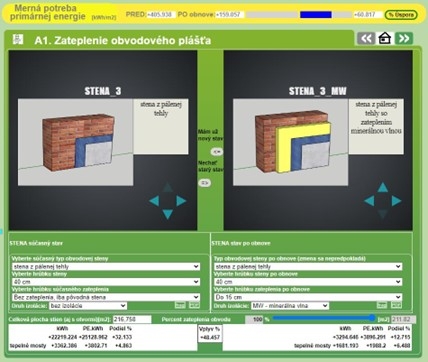 Následne kliknete na šípku smerujúcu doprava (označenú ako „Nechať starý stav“) a v pravej časti si šípkami hore-dole (prípadne v rolovacom menu) vyberáte materiál na zateplenie fasády a hrúbku zateplenia po obnove. Hore v žltej ploche vám program po každej zmene ukazuje energetickú spotrebu PRED a PO zateplení. Od tohto momentu si môžete v programe skúšať, akú úsporu by ste dosiahli pri rekonštrukcii rôznych častí domu. Napríklad pri fasáde je možné nastaviť, koľko metrov štvorcových fasády plánujete zatepliť.